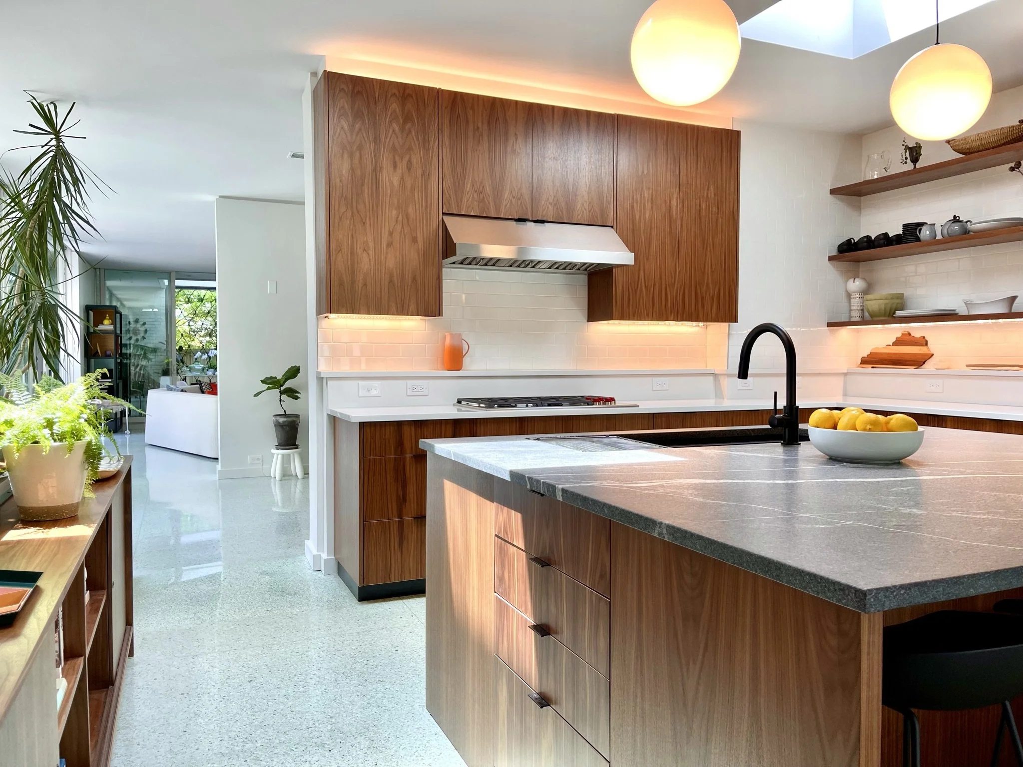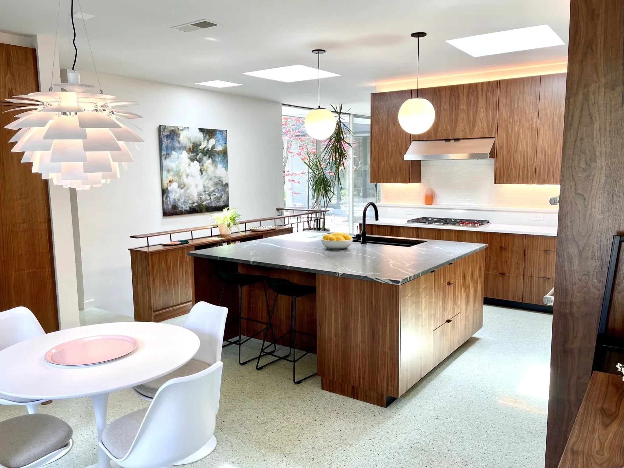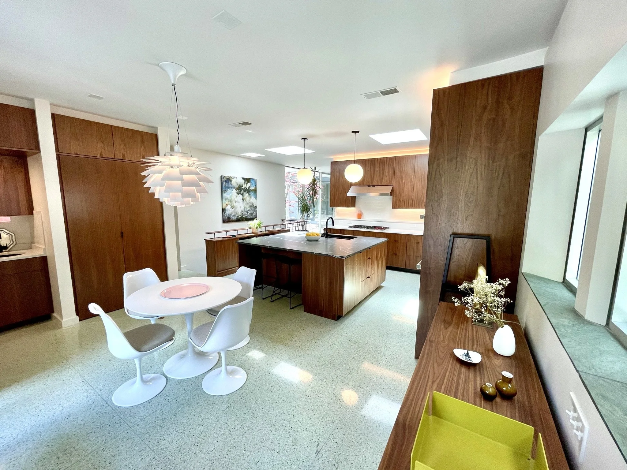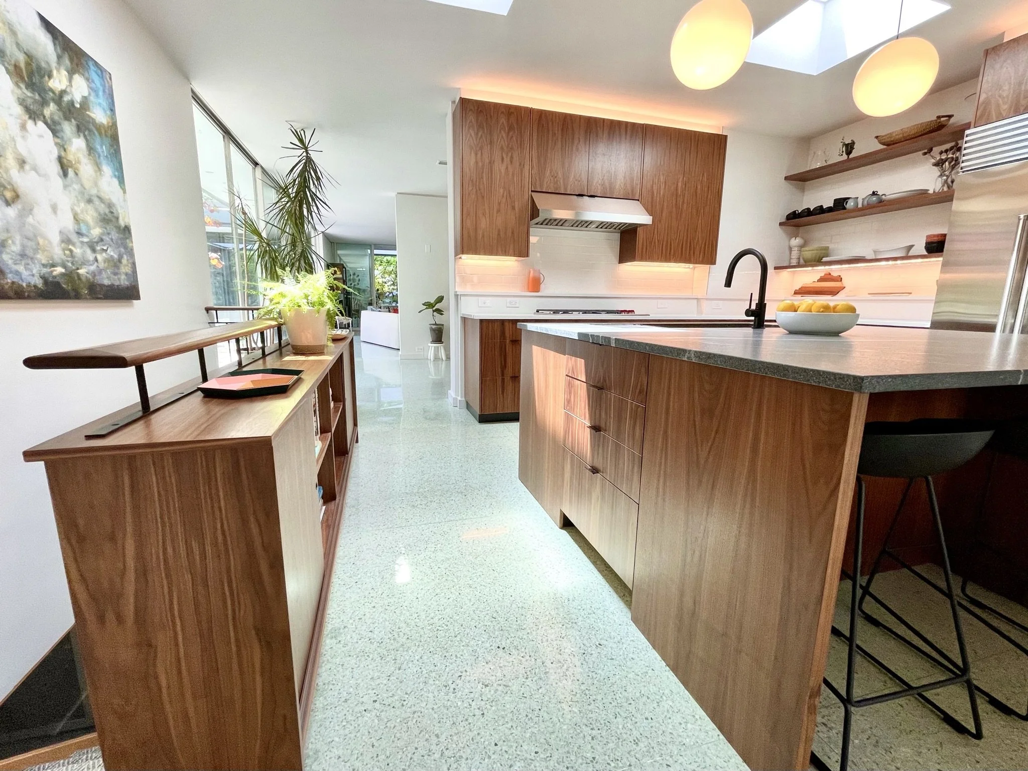 The original terrazzo floors were preserved and maintained while the kitchen was reconfigured to increase flow and workspace. Natural walnut wood was used for cabinetry and a quartzite island countertop serves as gathering place.