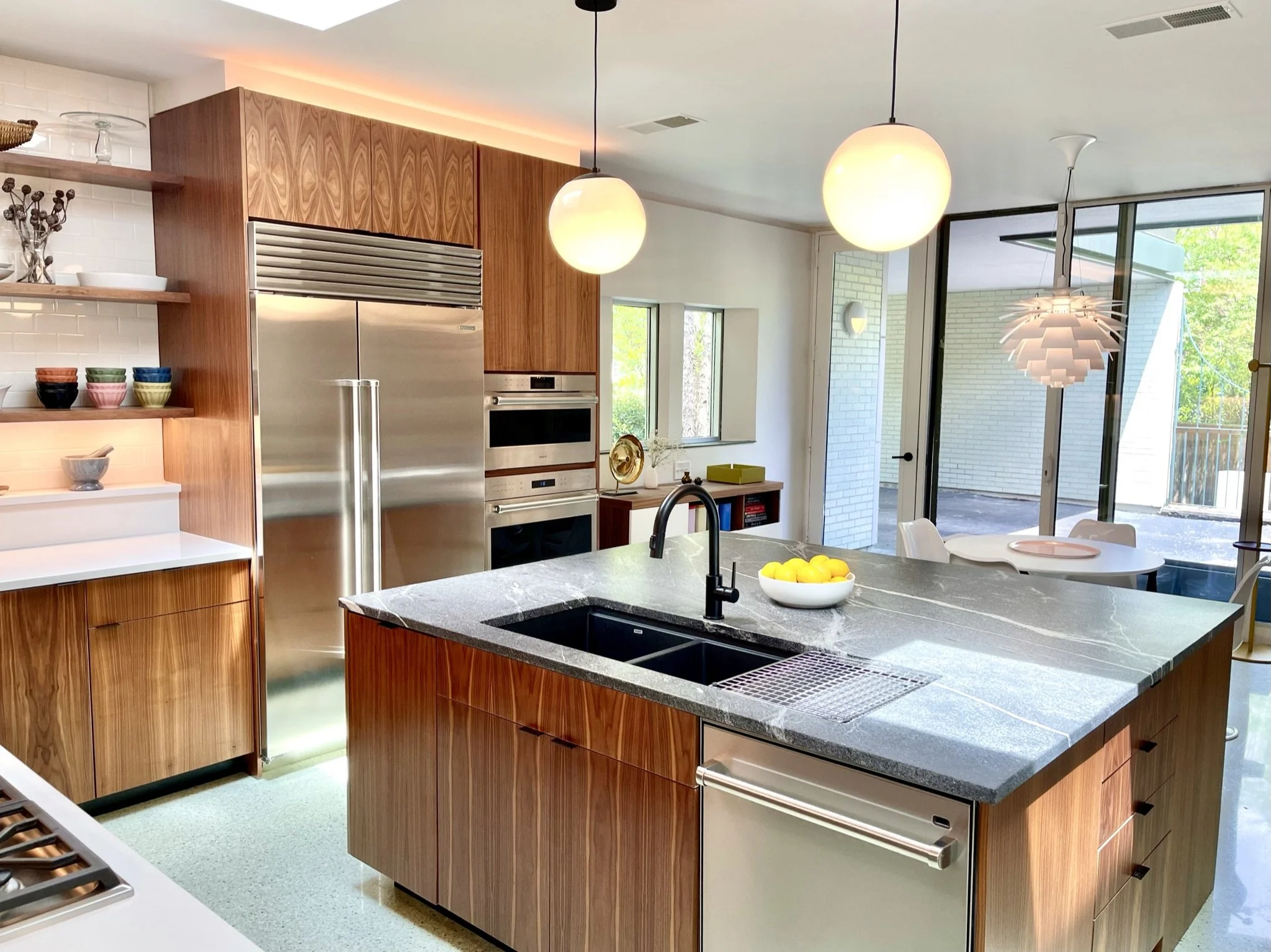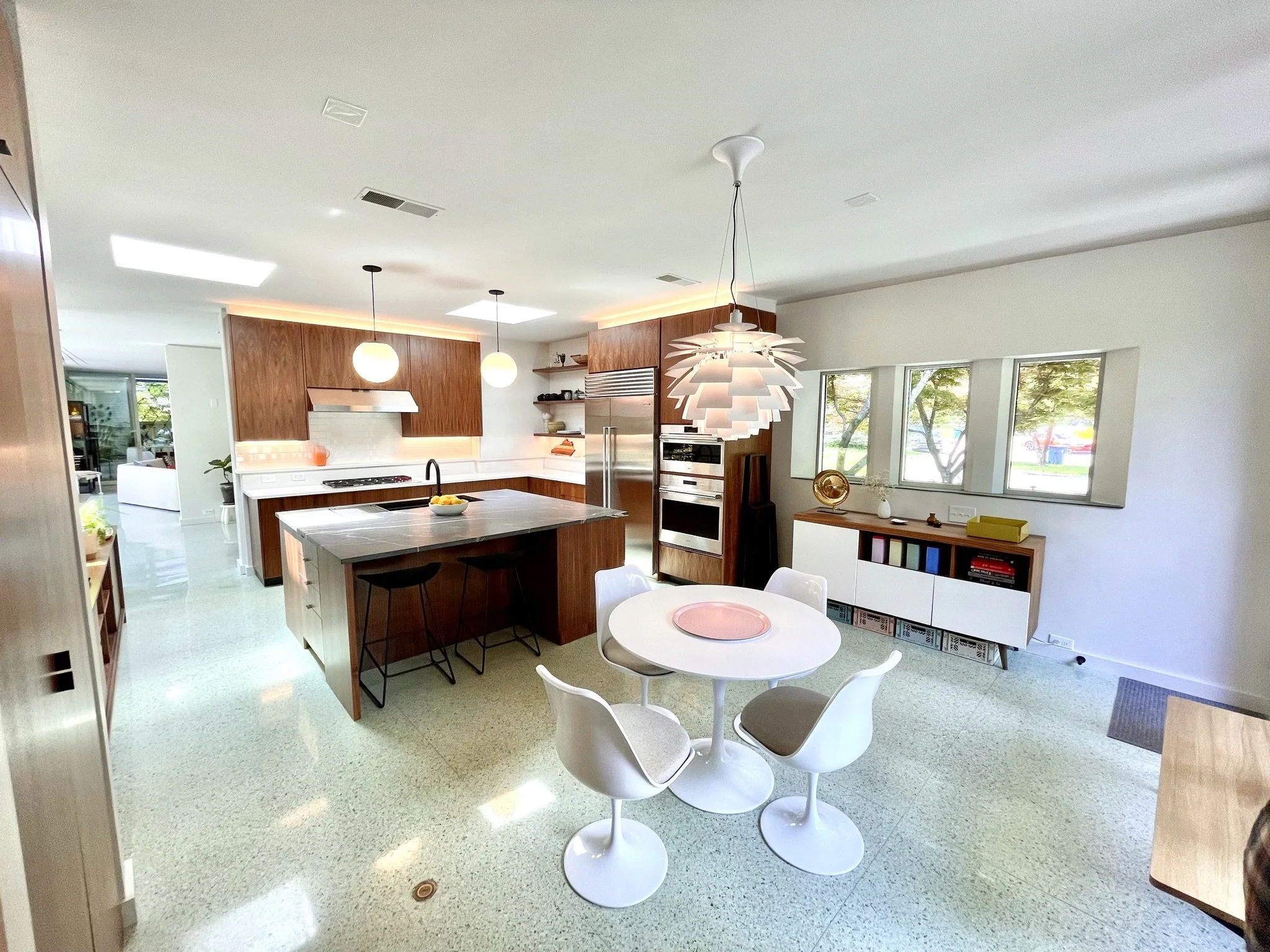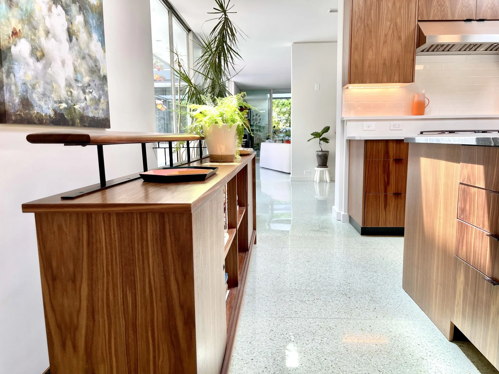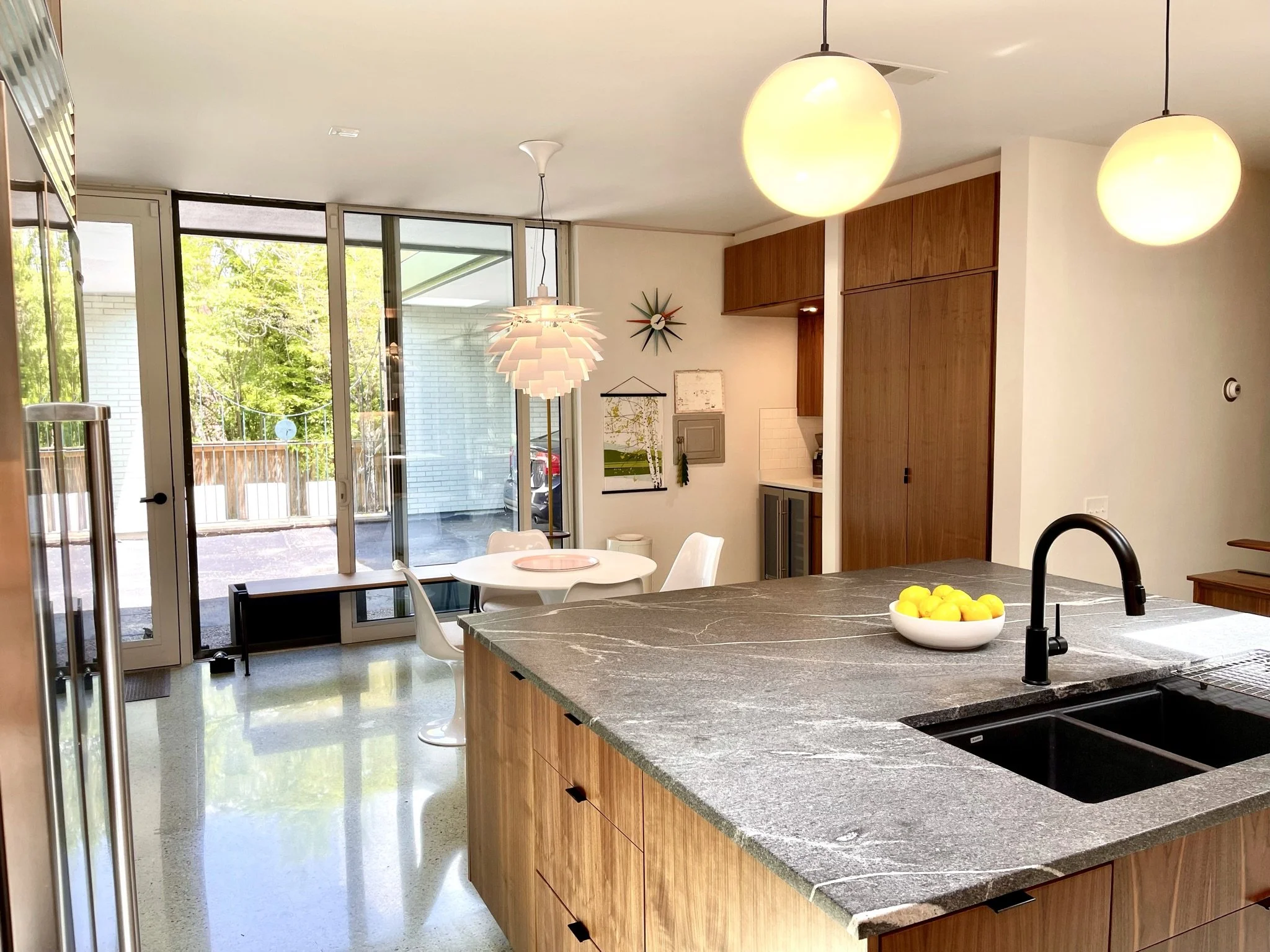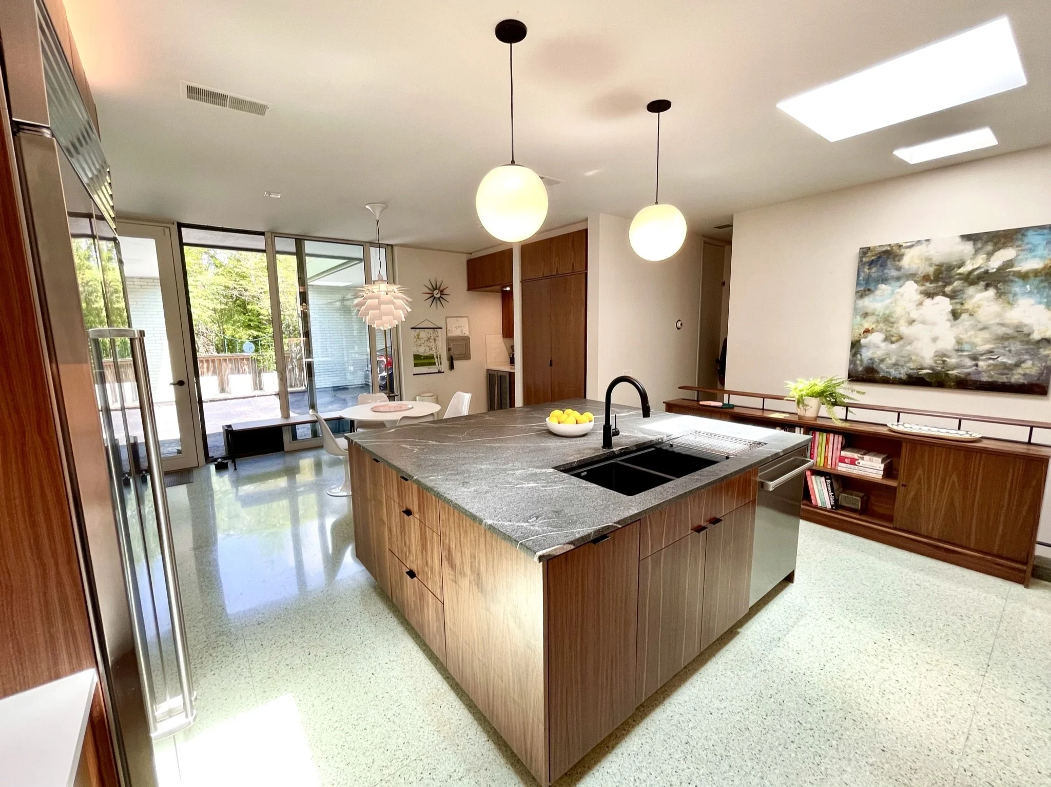 The original terrazzo floors were preserved and maintained while the kitchen was reconfigured to increase flow and workspace. Natural walnut wood was used for cabinetry and a quartzite island countertop serves as gathering place.