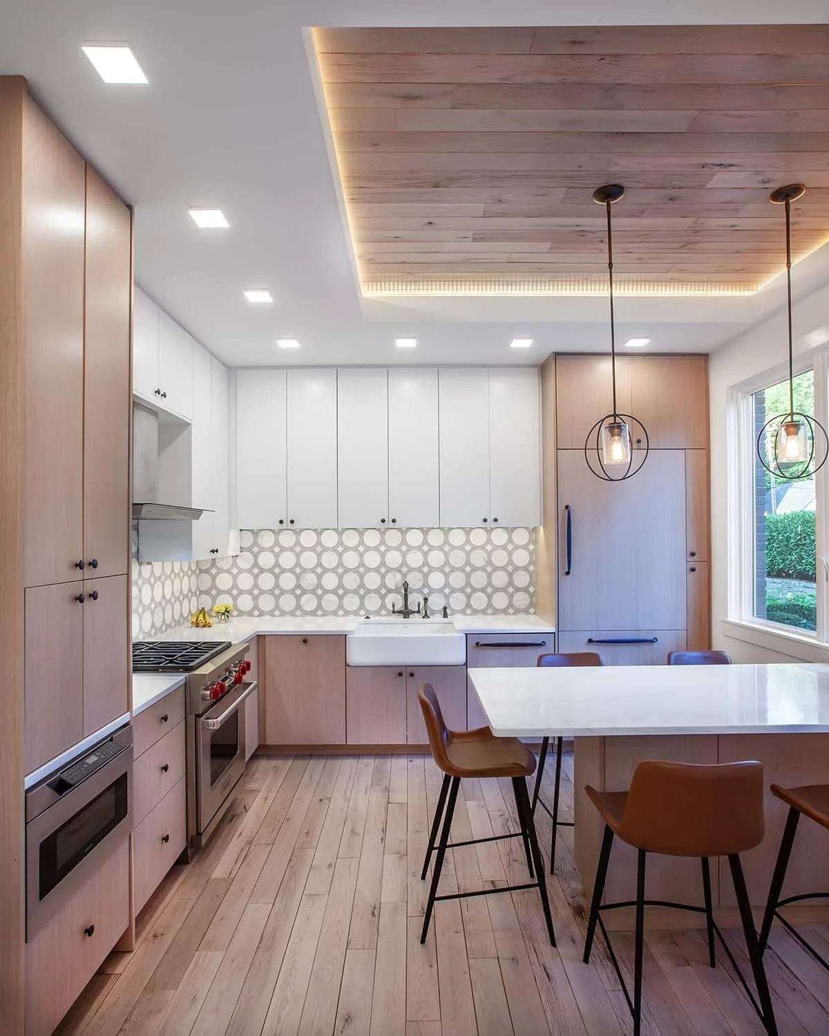 A large picture window replaced a small high window and needed storage space was added below the new peninsula table that doubles as dining and extra work surface. Refrigerator and freezer are concealed in the light-washed oak wood cabinetry.