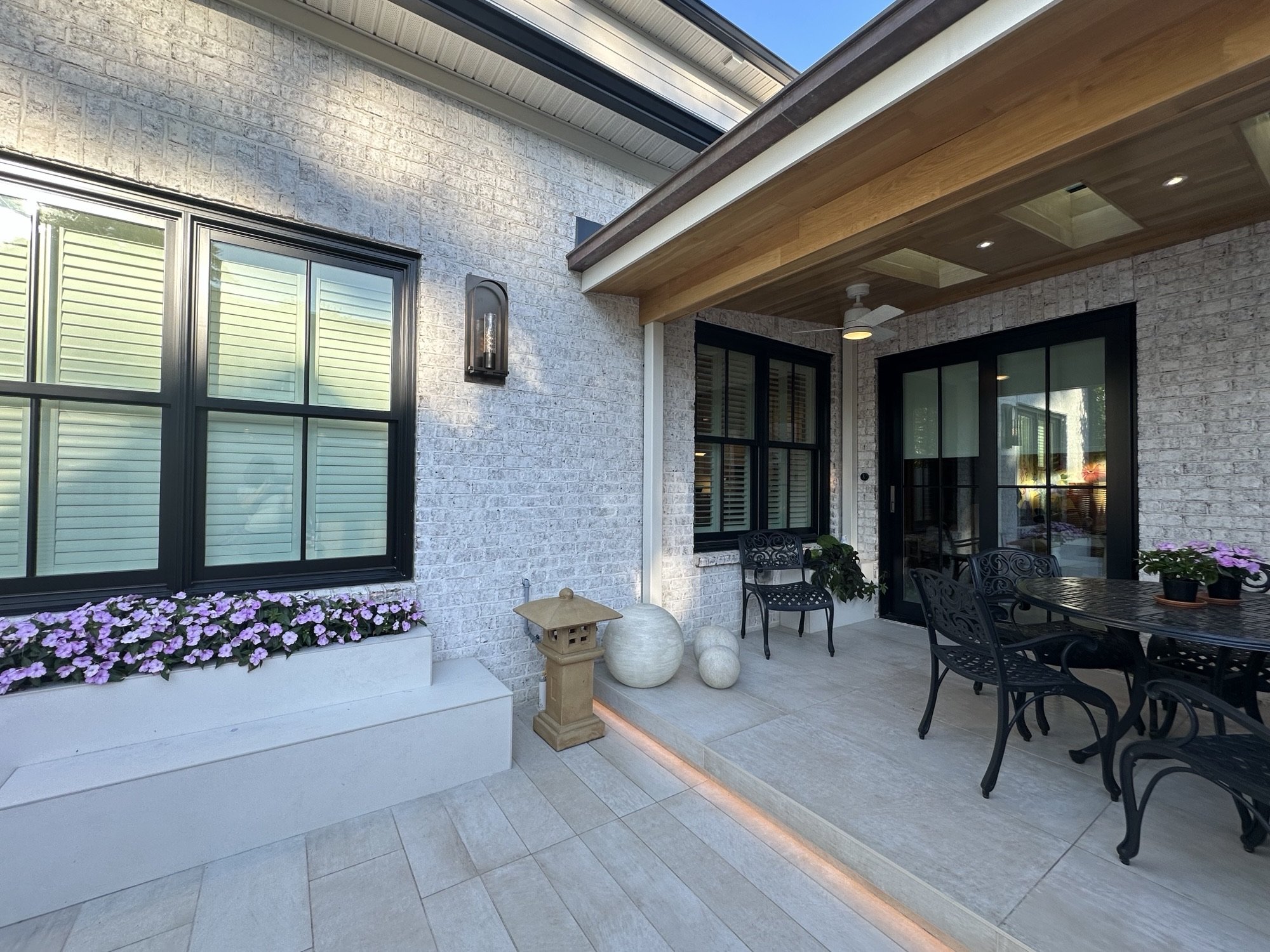 A new covered patio roof was added over the existing sliding doors with 3 skylights to allow natural light to filter the sitting area. Custom built in planters and bench seating are clad with large porcelain panels to match the flooring and privacy walls.