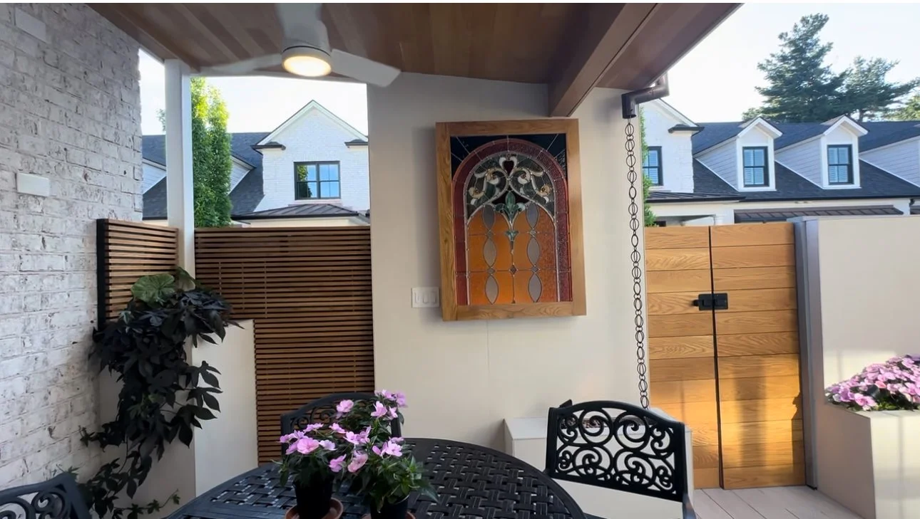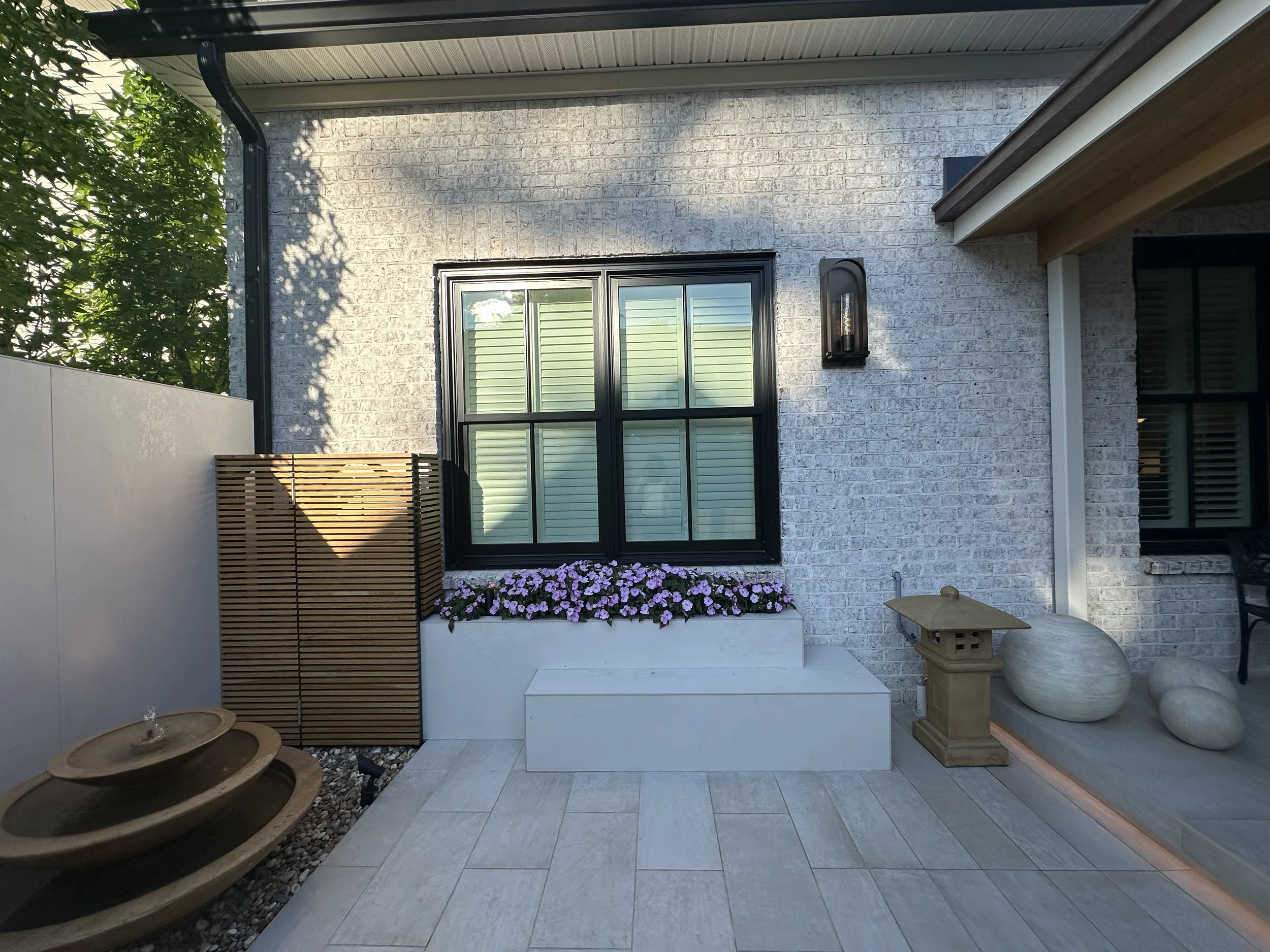 Exterior renovation for a peaceful patio scape with essential elements: water, light, shelter and plantings.