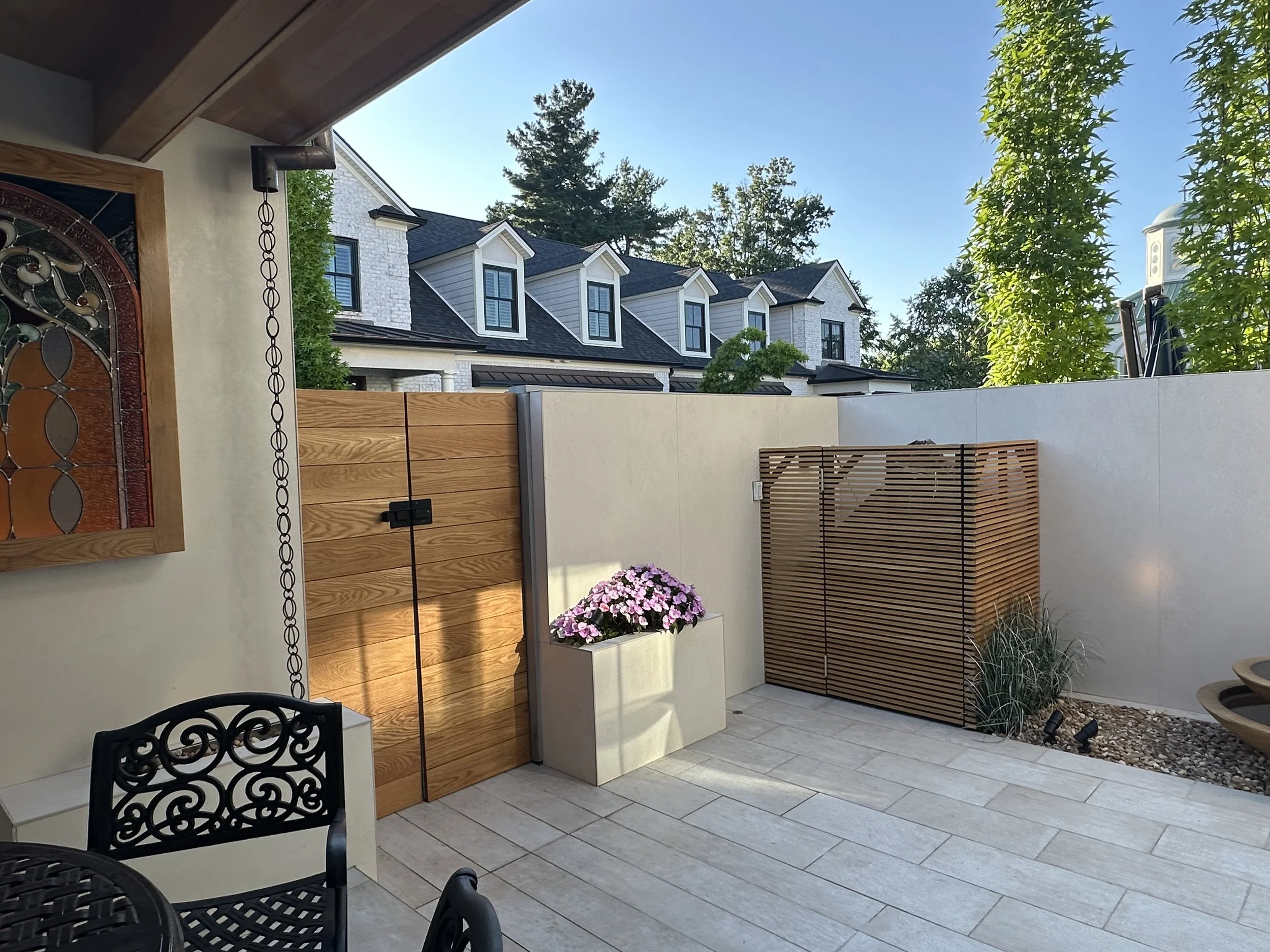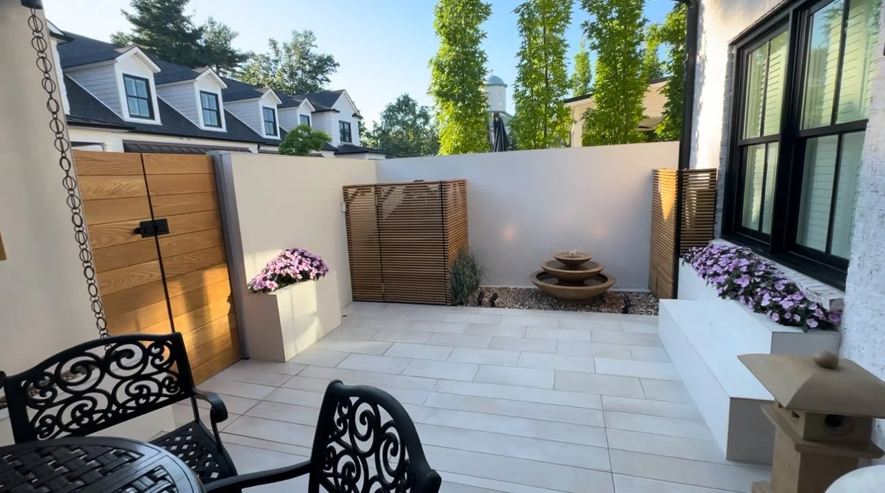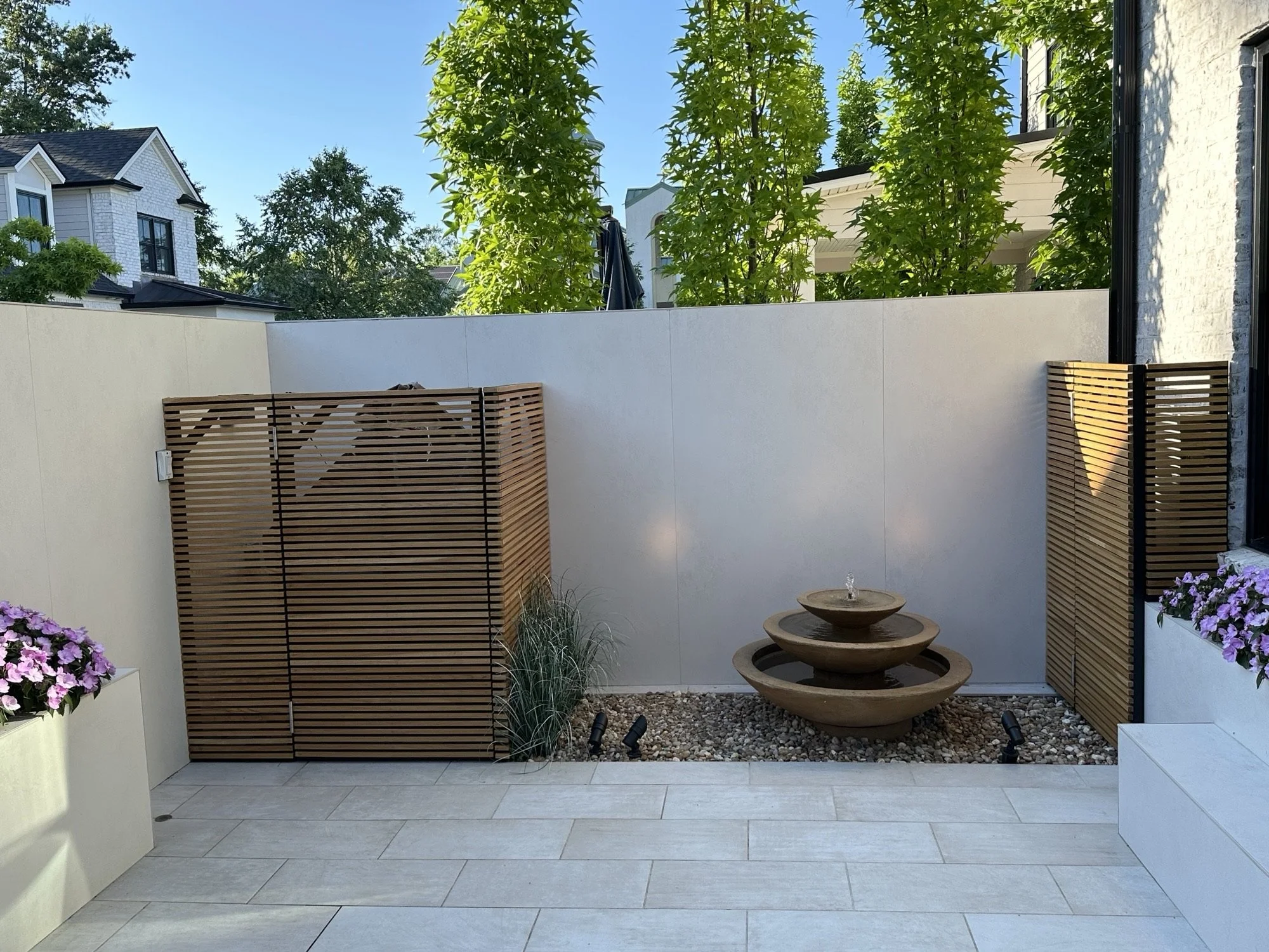 Full height porcelain-tile panels clad the privacy walls and custom planters while serving as a soft backdrop to the barbeque grill and water meter which are screened from view and easily accessible when needed. A water fountain adds serenity and a visual focal point from the covered sitting area.