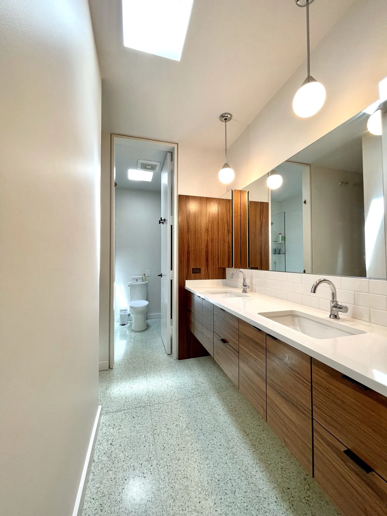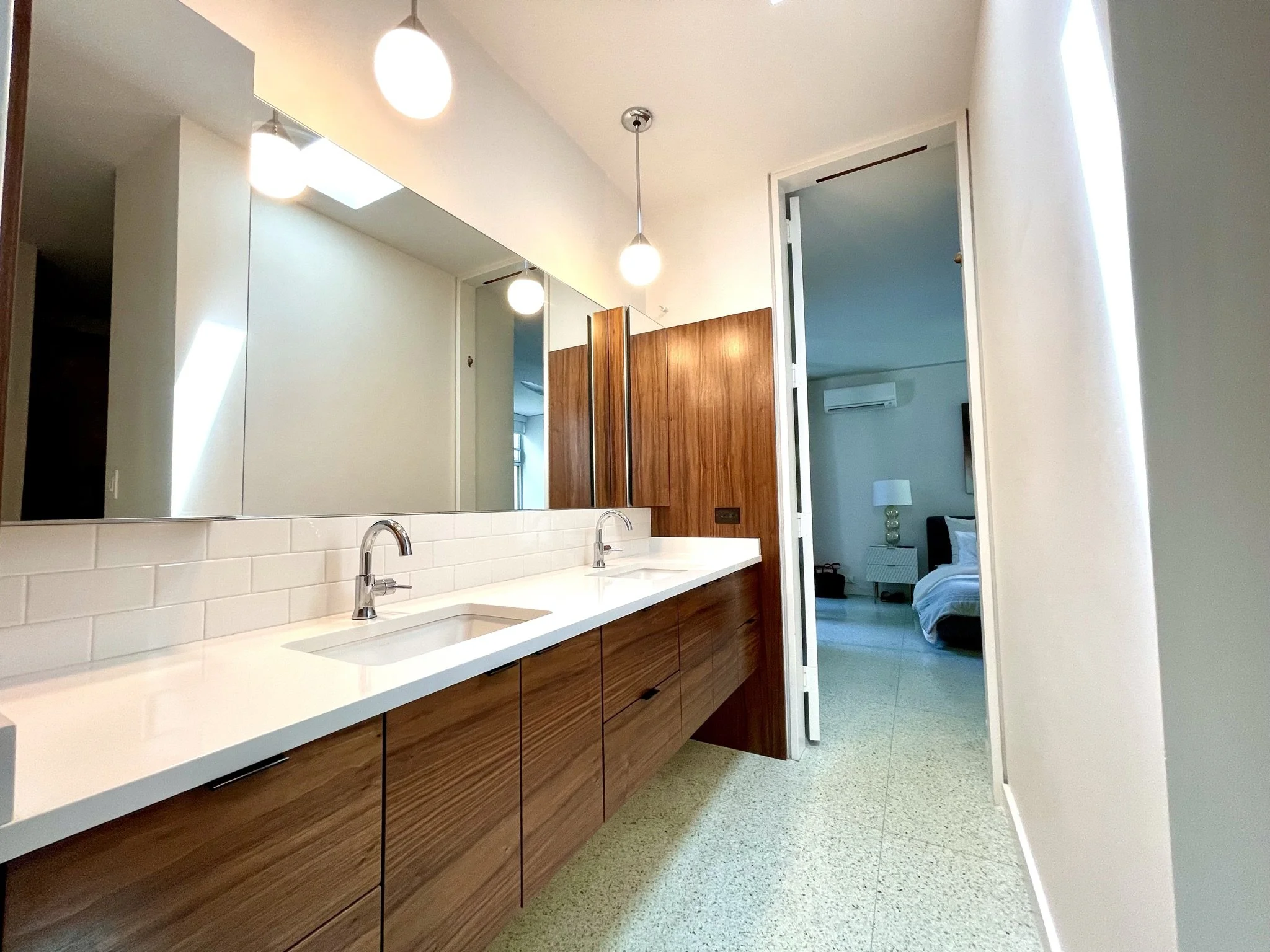 The master bath showcases the same natural walnut and simple white quartz countertop.